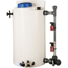 DOSIERBEHÄLTER MIT AUSSENLIEGENDER FÜLLSTANDSANZEIGE UND DREI-WEGE-KUGELHAHN- geschlossener, runder, zylindrischer, stehender Behälter aus UV-Stabilisiertes Polyethylen, lebensmittelecht, mit Schraubdeckel blau und Dichtung - Farbe: natur transparent, stoß- und schlagfest - nahtlos im Rotationsschmelzverfahren hergestellt. - eingeformte Literskala und mitgeformte Montagebrücke für Dosierpumpen, Rührwerke, Handstampfmischer, Handrührwerke etc. - 3/4" Auslauf (Innengewinde) mit Stopfen, Auslauf nicht aufgebohrt ausgerüstet mit: - seitlich eingeschweißtem PE Stutzen mit V-Bund und PP/ST Flansch DN 15, d 20 mm - oben aufgeschweißten Verschraubungsanschluss aus PE, DN 25, d 32 mm - außenliegender Füllstandsanzeige aus PVC Transparent mit PP Schwimmer und Drei-Wege-Kugelhahn aus PVC U - aufgeschweißten PE Rohrklemmen aus PE zur Aufnahme der Füllstandsanzeige - eingeschweißtem PE Bogen mit 2- Wege Ablaufkugelhahn DN 15, da 20 mm aus PP/EPDM und aufgeschweißter PE Rohrklemme Sie können den Dosierbehälter mit außenliegender Füllstandsanzeige, Schwimmer und Drei-Wege-Kugelhahn im Webshop direkt online einkaufen. Andere Anschlussvarianten auf Anfrage möglich. |