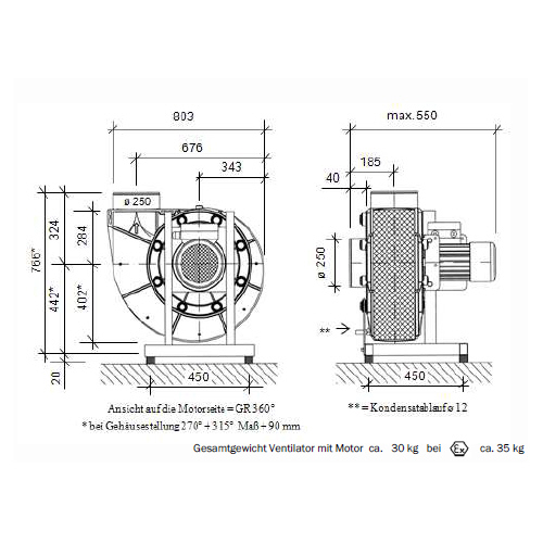 Gehäusestellung GL,  Ausblasrichtung 45° / 90° / 135° / 180° / 270° / 315° /360°