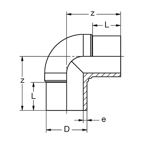 Außendurchmesser und Wanddicke entsprechend DIN EN ISO 15874.Toleranzen bei den Z-Maßangaben sind abhängig von der Dimension. Bis d/D 160 = +/- 3 mm. Ab d/D 180 = +/- 10 mm.
