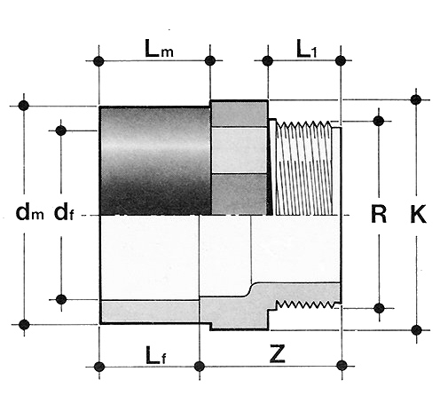 | - nur für Kunststoffgewinde -Anschluss: Klebemuffe bzw.-stutzen / Außengewinde - konische Gewinde nach ISO7-1 |