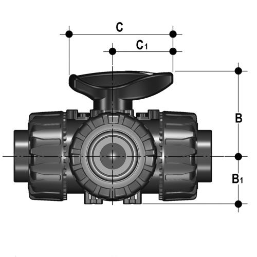 | -Bohrung: L-Bohrung -Anschluss: Klebemuffe -radial ein- und ausbaubar -mit gesicherter Überwurfmutter -Dichtung: PTFE/EPDM -mit allseitigen Festflanschen aus PVC-U auf Anfrage |