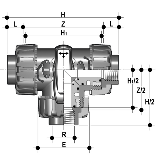 PVC-U 3-Wege-Kugelhahn, T-Bohrung, Gewindemuffe, FPM